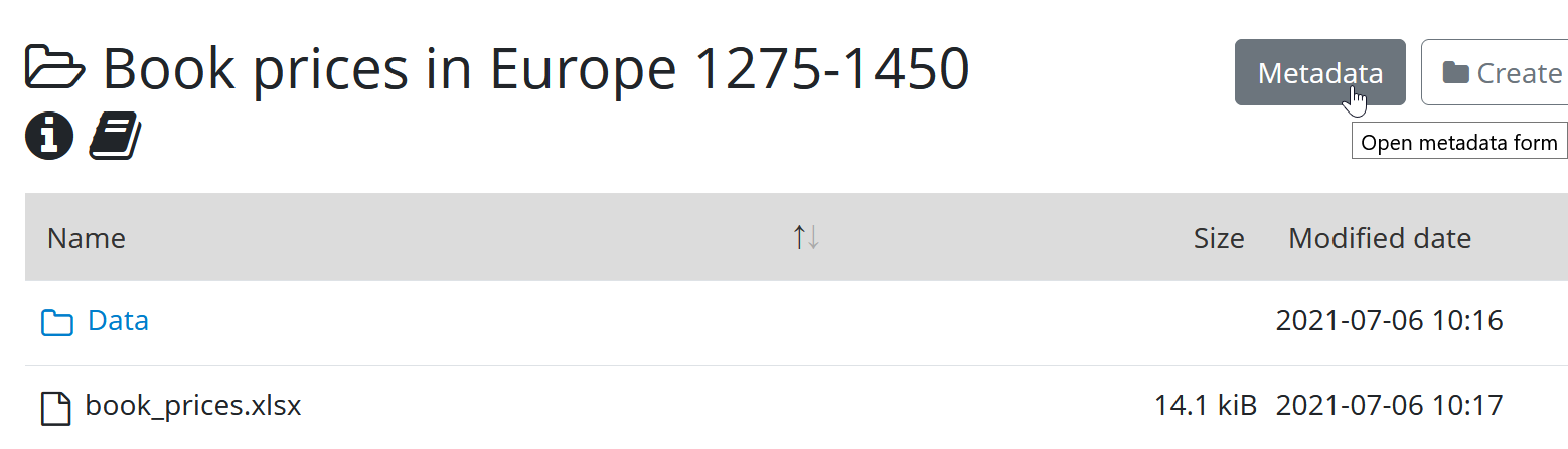 1. navigate to the folder in the Yoda portal and press the “Metadata” button.