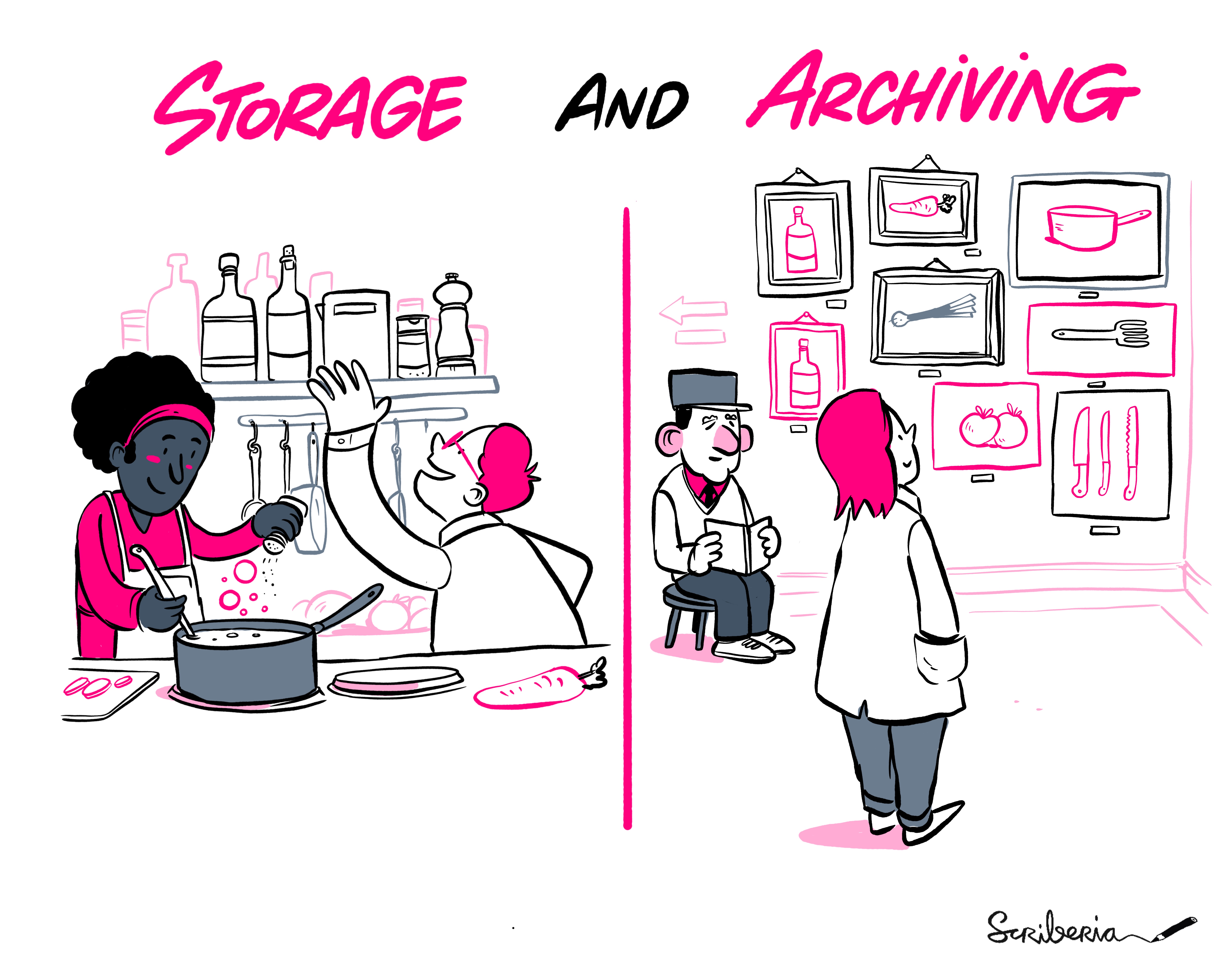 A Scriberia illustration showing storage on the left, in a kitchen space with storage making things available, and archiving on the right, in a museum where it is available for viewing.